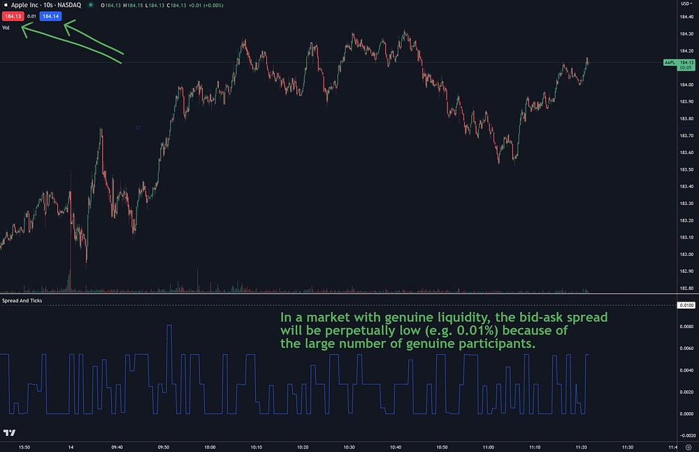 Genuine liquidity refers to liquidity that is stable, predictable and sustainable, or otherwise legitimate. Seeing a $0.01 spread on a $200–500 asset like AAPL or SPY is a result of many diverse market participants acting in different ways. These participants are buying or selling because they have a fundamental interest in the asset itself, or they believe in its long-term value. And because there are so many such actors, they are illustrated on the tape many times per second. In a market with majority genuine liquidity, price movements are more reflective of the true value of the asset, as they are the manifestation of a cumulative result of all market participants.
